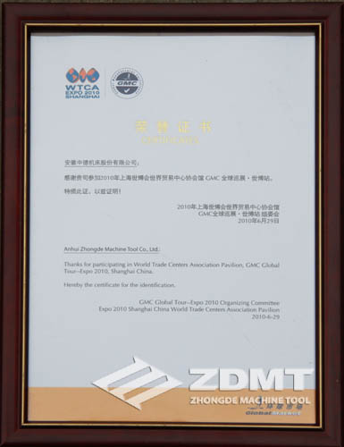 2010年7月1日下午,一場(chǎng)貼上“中國(guó)制造,世界的驕傲”標(biāo)簽的各行業(yè)標(biāo)志性品牌在上海世博會(huì)世界貿(mào)易中心協(xié)會(huì)GMC館高調(diào)亮相。安徽中德機(jī)床股份有限公司領(lǐng)航國(guó)內(nèi)機(jī)床行業(yè)其他品牌,作為行業(yè)代表身份出席,參加了企業(yè)亮燈儀式同時(shí)接受GMC委員會(huì)頒發(fā)的獎(jiǎng)牌和證書,正式成為“2010年世博會(huì)世界貿(mào)易中心協(xié)會(huì)館贊助商GMC成員”,此舉在對(duì)中德機(jī)床綜合實(shí)力提升和在行業(yè)中領(lǐng)先地位的充分肯定的同時(shí),也對(duì)我們提出了更高的要求,我們將為創(chuàng)建一個(gè)具有國(guó)際競(jìng)爭(zhēng)力的卓越企業(yè)、鍛造一個(gè)具有百年發(fā)展的民族品牌而繼續(xù)努力!